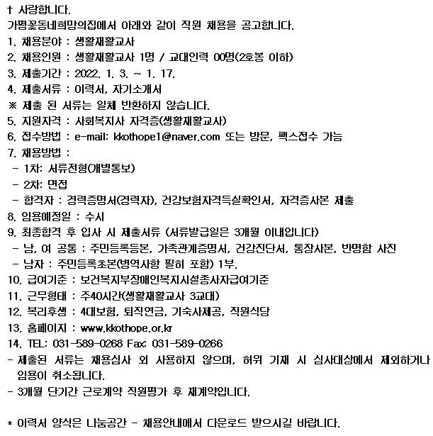 - 가평꽃동네희망의집 생활재활교사 채용공고