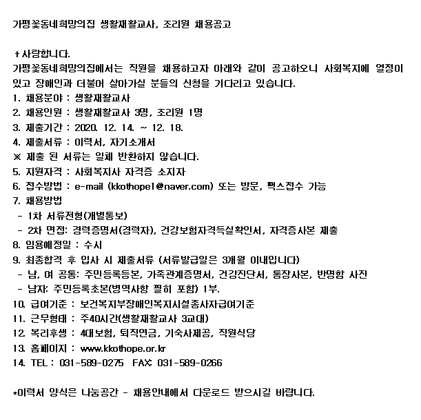 - 가평꽃동네희망의집 생활재활교사, 조리원 채용공고